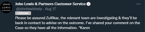 I was told that the investigation was still ongoing and there was no update from the Supplier. Their CRM system had a note that I would get an update call on Wednesday 17th August. I said this was unacceptable only to be told there was nothing they could do.