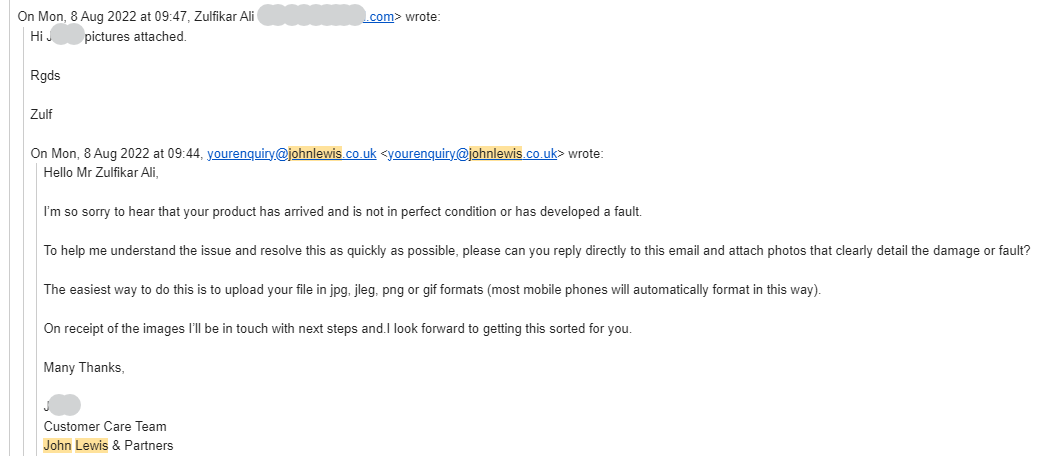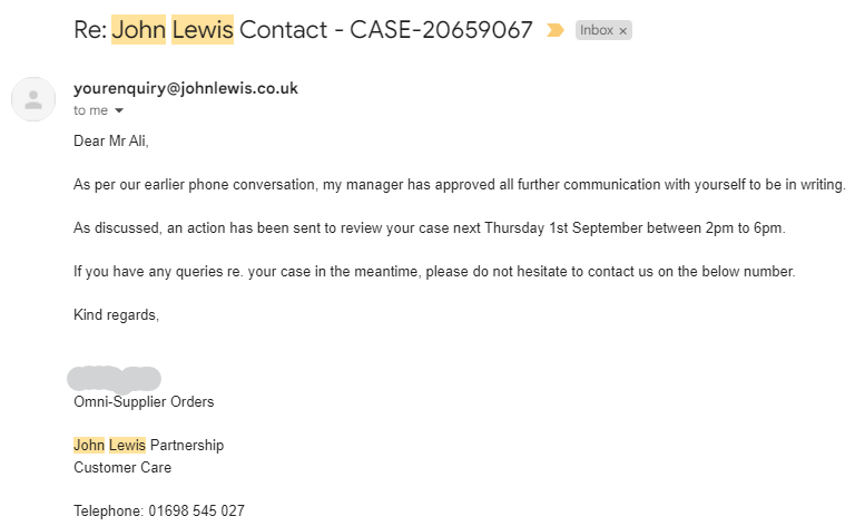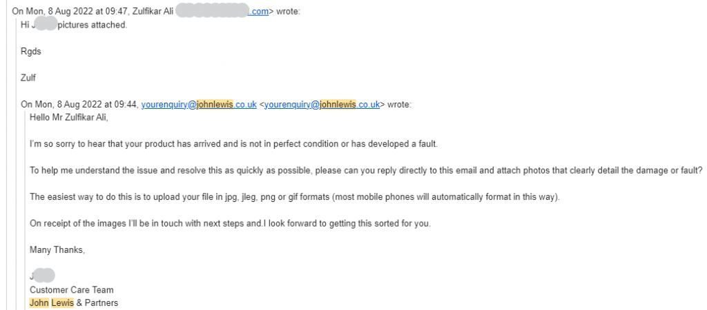 I immediately called John Lewis on 0345 610 0338 and spoke to a customer service agent: