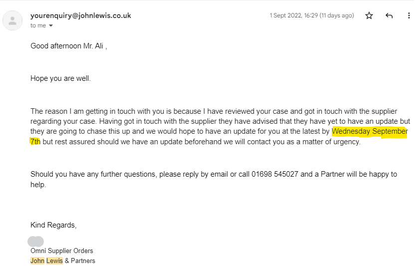 At this point the CS agent basically repeated what the last 2 CS conversations had been, almost to the letter “We have no update, Supplier is investigating. Our system says we will next update you on Thursday 1st September”