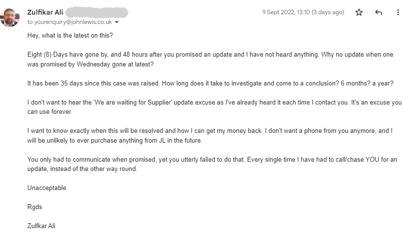 I was generous. I gave them an extra 48 hours to provide me an update. Nothing. So I chased by email: